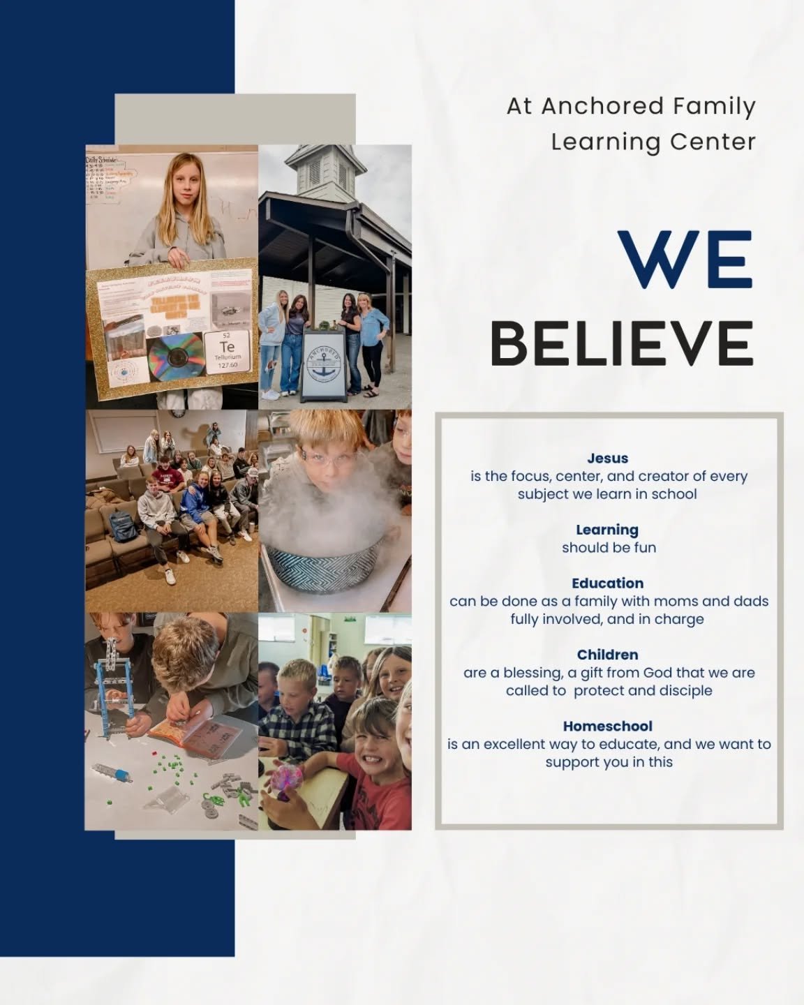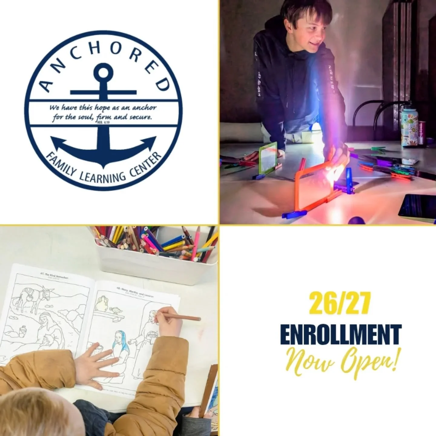 The purpose of Anchored Family Learning Center shall be to provide support and encouragement to homeschooling families that are seeking an alternative Christian education for their children.